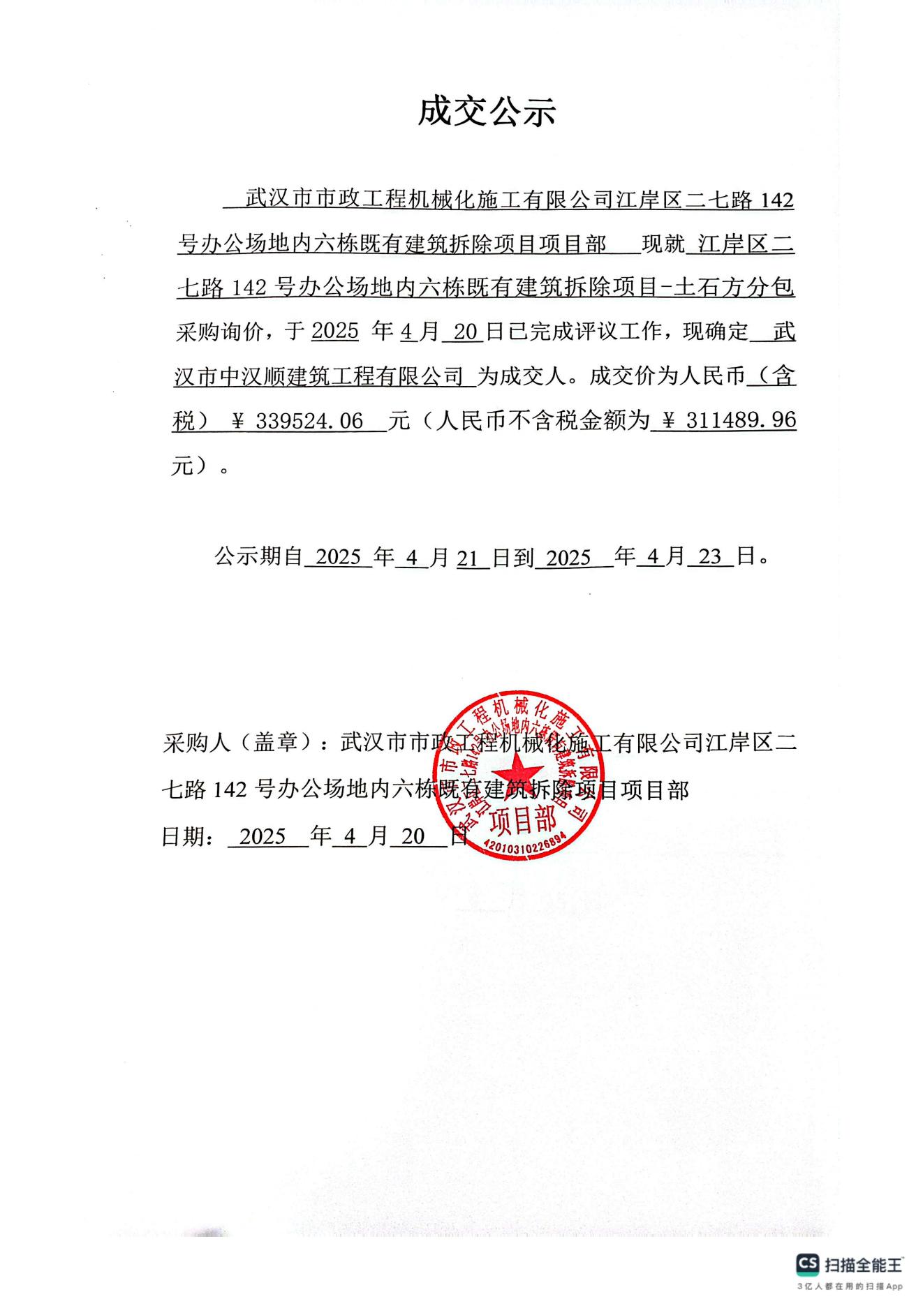 江岸區二七路142號辦公場地內六棟既有建筑拆除項目-土石方分包成交公告