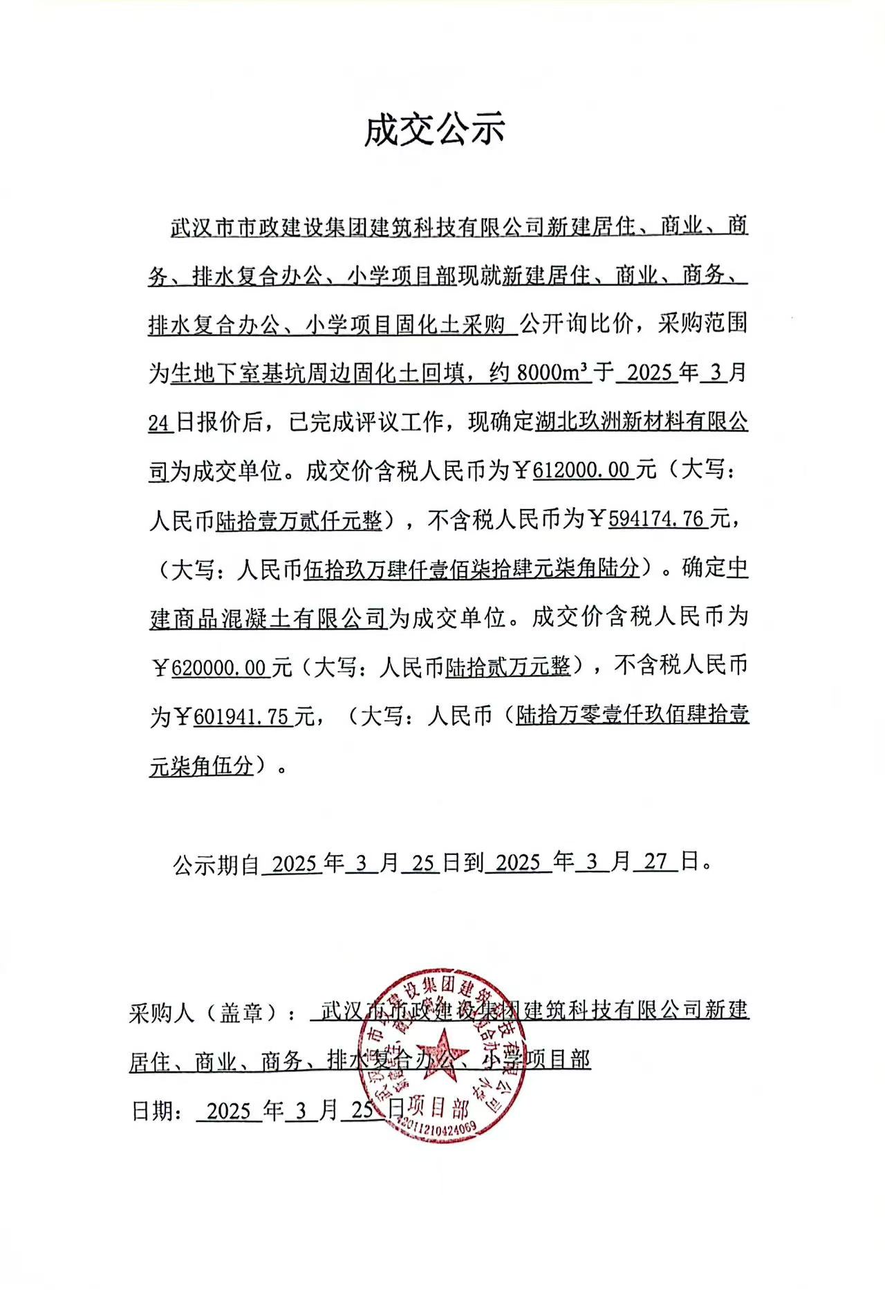 武漢市市政建設(shè)集團(tuán)建筑科技有限公司新建居住、商業(yè)、商務(wù)、排水復(fù)合辦公、小學(xué)項(xiàng)目固化土采購成交公示