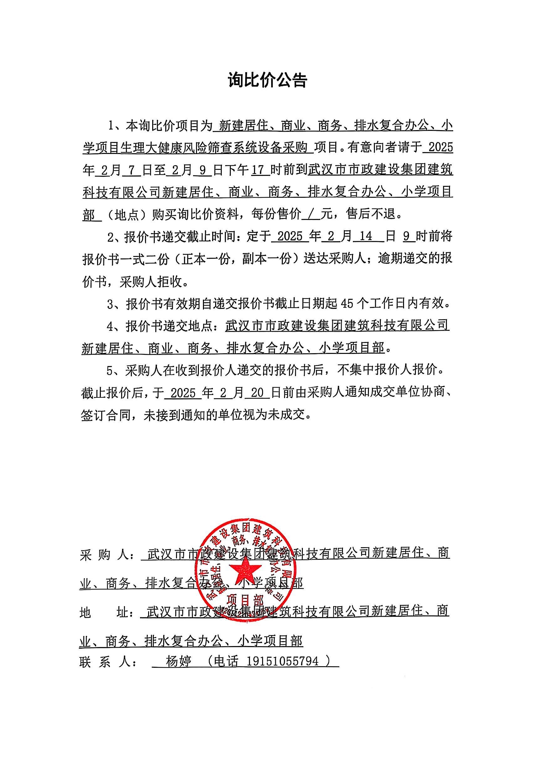 武漢市市政建設(shè)集團建筑科技有限公司新建居住、商業(yè)、商務(wù)、排水復(fù)合辦公、小學(xué)項目生理大健康風(fēng)險篩查系統(tǒng)設(shè)備采購詢價公告