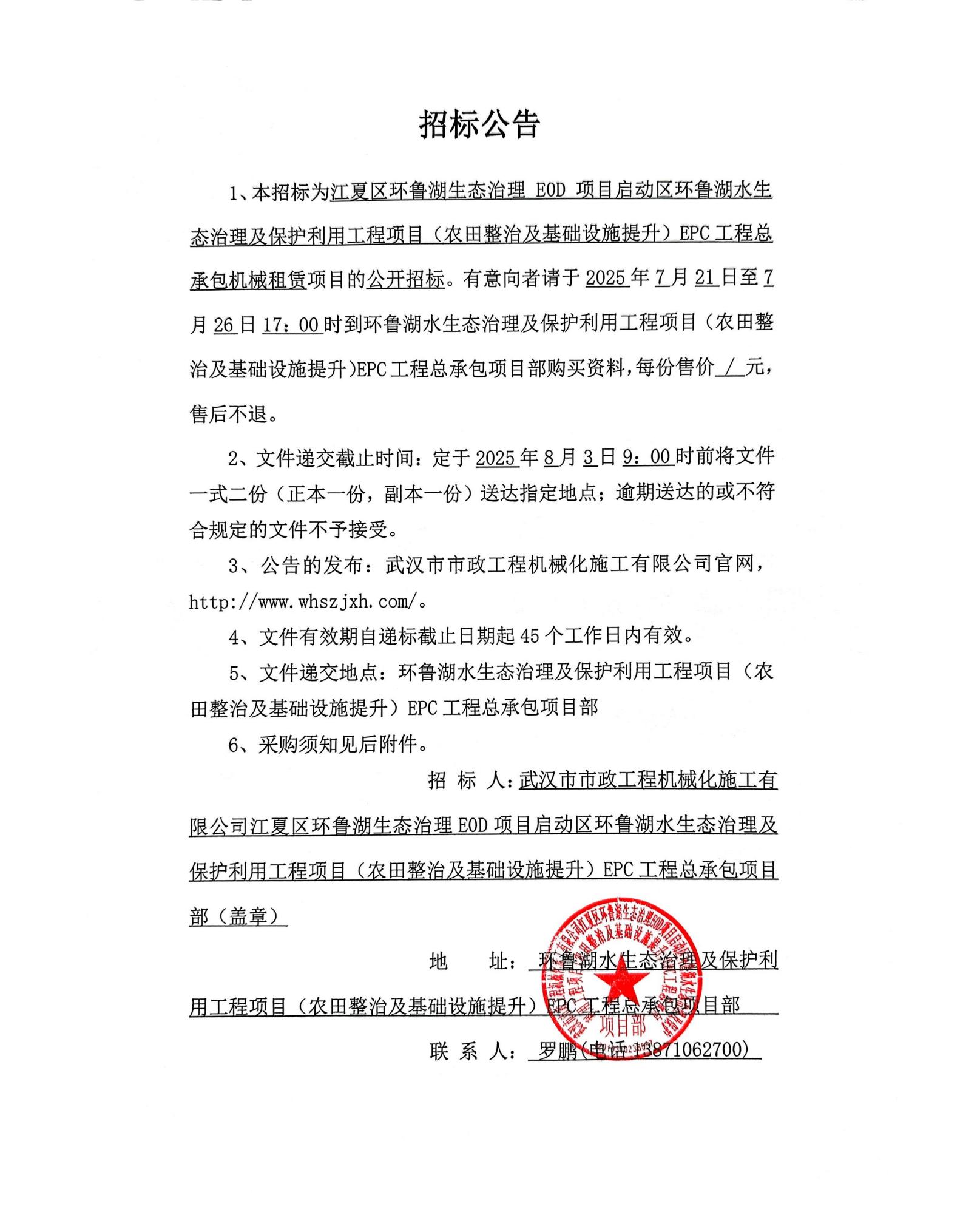 江夏區(qū)環(huán)魯湖生態(tài)治理 E0D 項(xiàng)目啟動(dòng)區(qū)環(huán)魯湖水生態(tài)治理及保護(hù)利用工程項(xiàng)目(農(nóng)田整治及基礎(chǔ)設(shè)施提升)EPC工程總承包機(jī)械租賃招標(biāo)公告