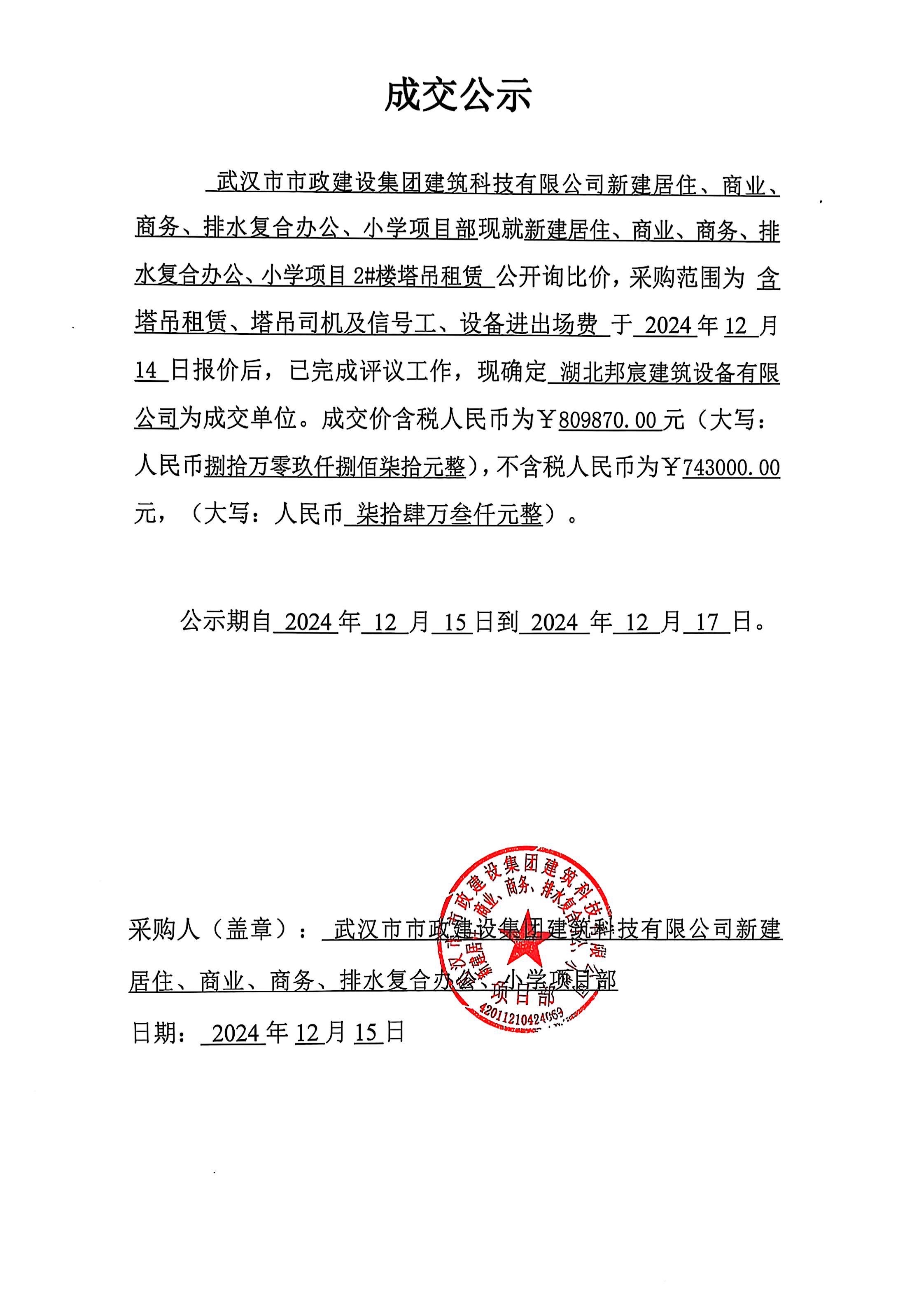 武漢市市政建設(shè)集團(tuán)建筑科技有限公司新建居住、商業(yè)、商務(wù)、排水復(fù)合辦公、小學(xué)項(xiàng)目2#樓塔吊租賃成交公示