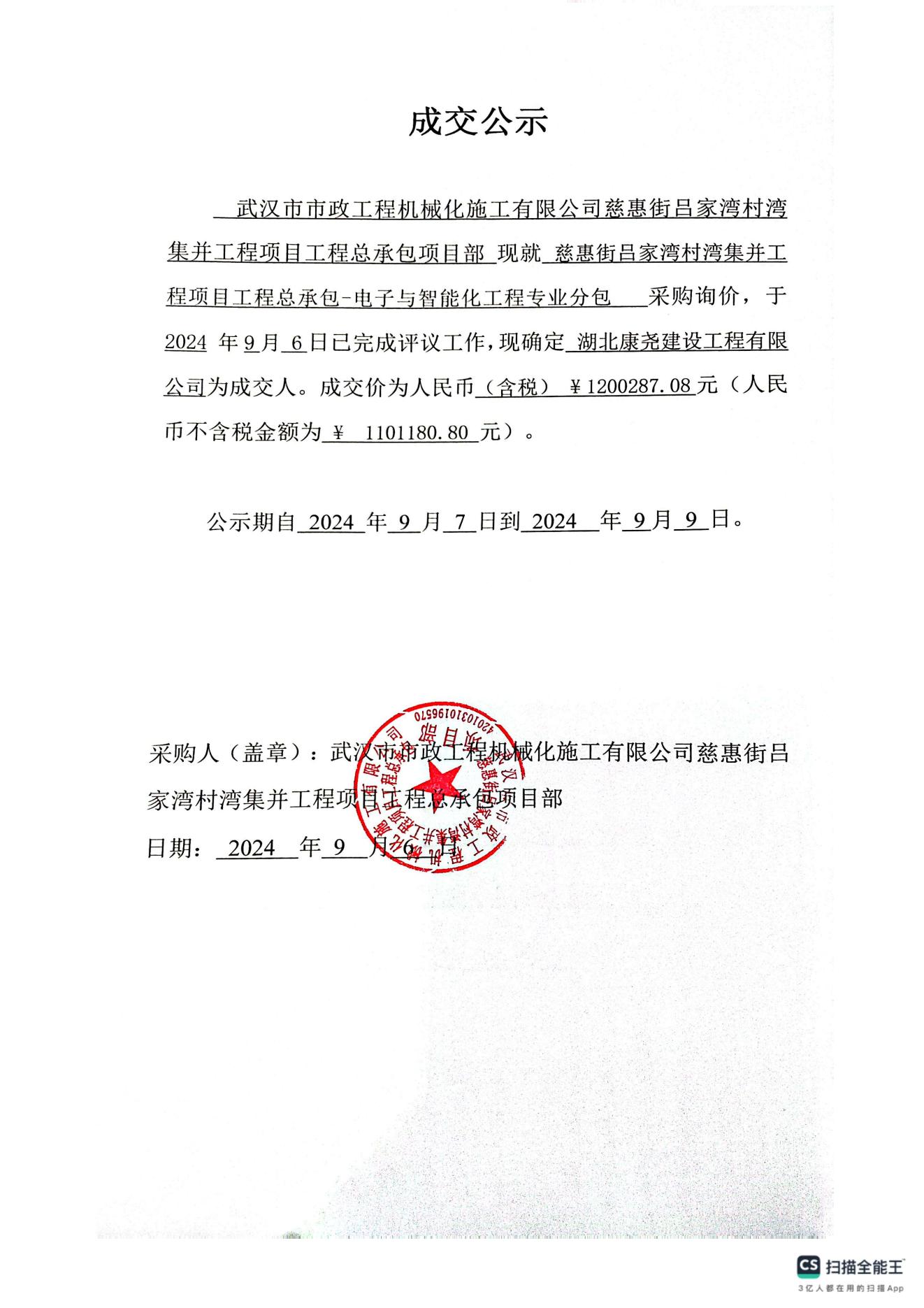 慈惠街呂家灣村灣集并工程項(xiàng)目工程總承包-電子與智能化工程專業(yè)分包成交公示