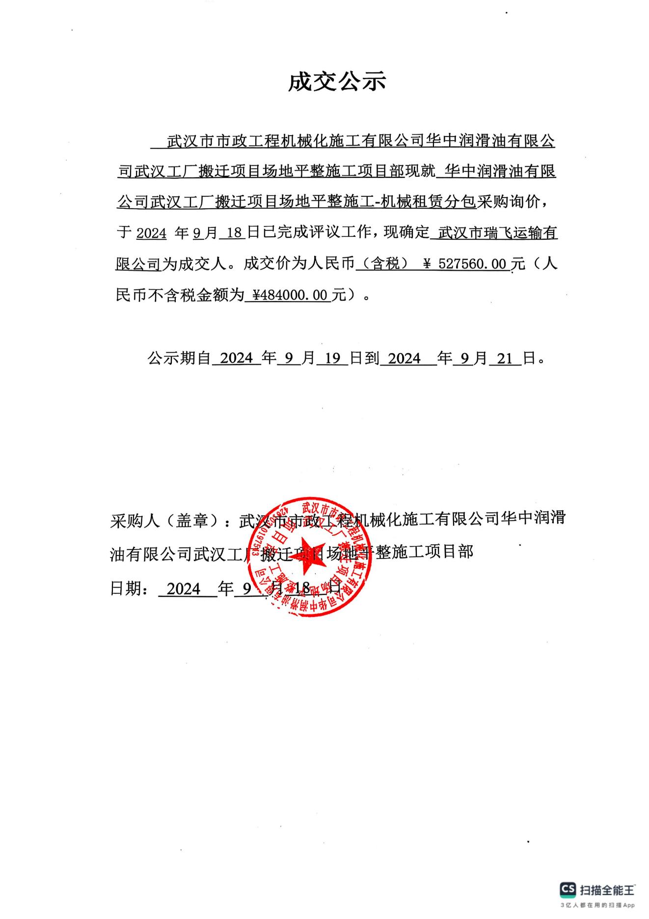 華中潤滑油有限公司武漢工廠搬遷項(xiàng)且場地平整施工機(jī)械租賃分包成交公示