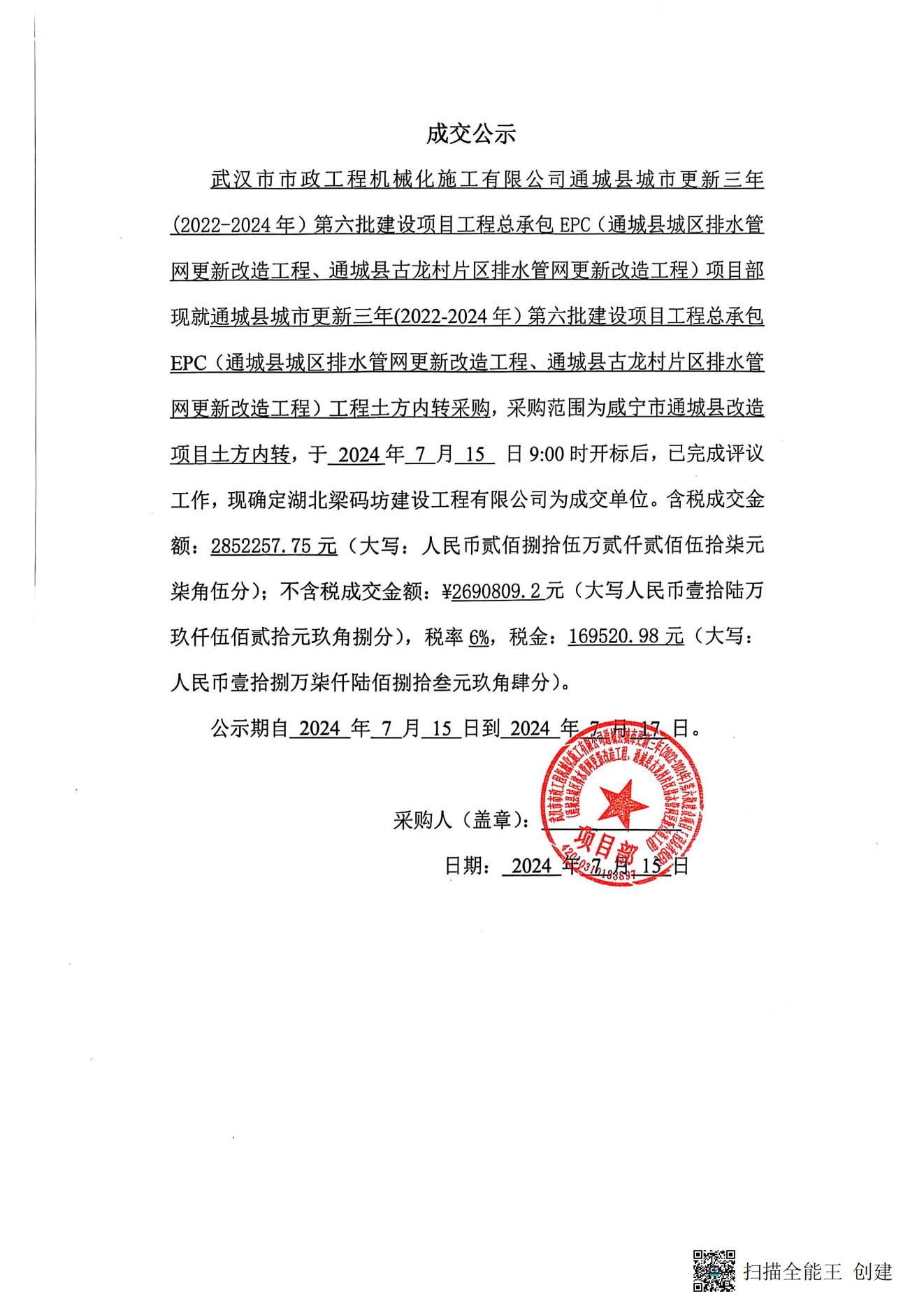 通城縣城市更新三年(2022-2024年)第六批建設(shè)項目工程總承包EPC(通城縣城北城中城南片區(qū)排水管網(wǎng)更新改造項目)土方內(nèi)轉(zhuǎn)工程成交公示