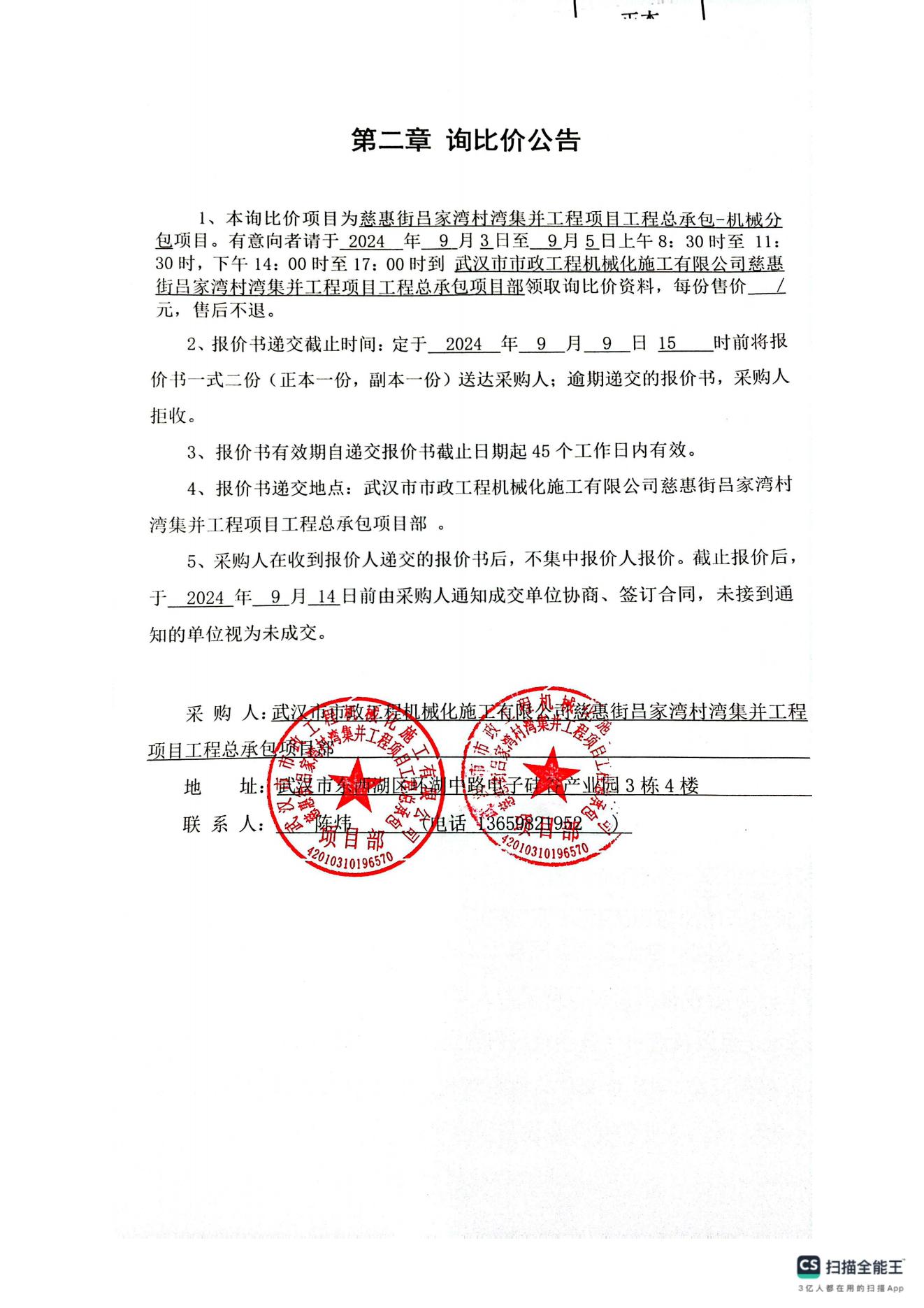 慈惠街呂家灣村灣集并工程項目工程總承包-機(jī)械分包詢價公告