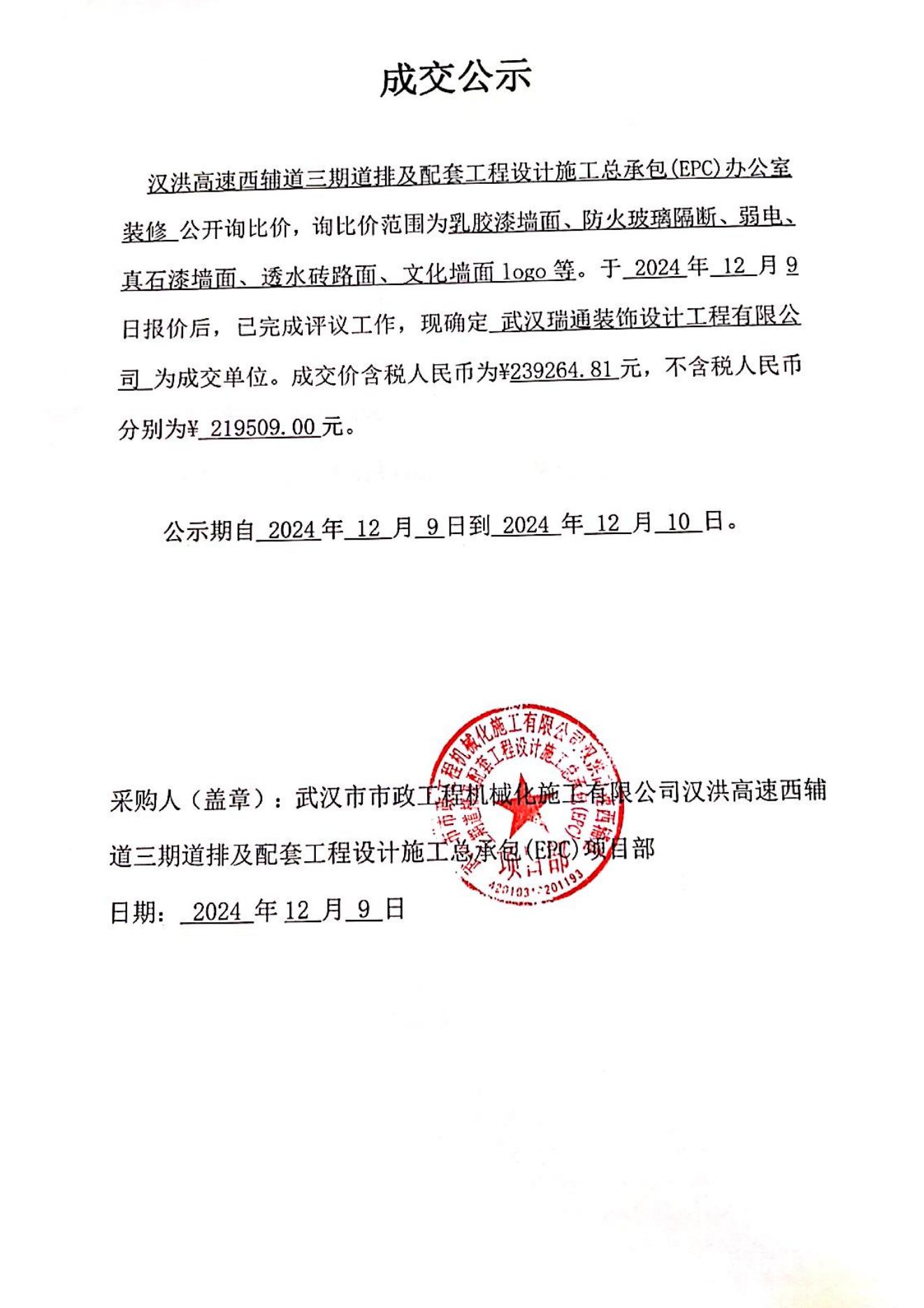 漢洪高速西輔道三期道排及配套工程設(shè)計施工總承包(EPC)辦公室裝修成交公示